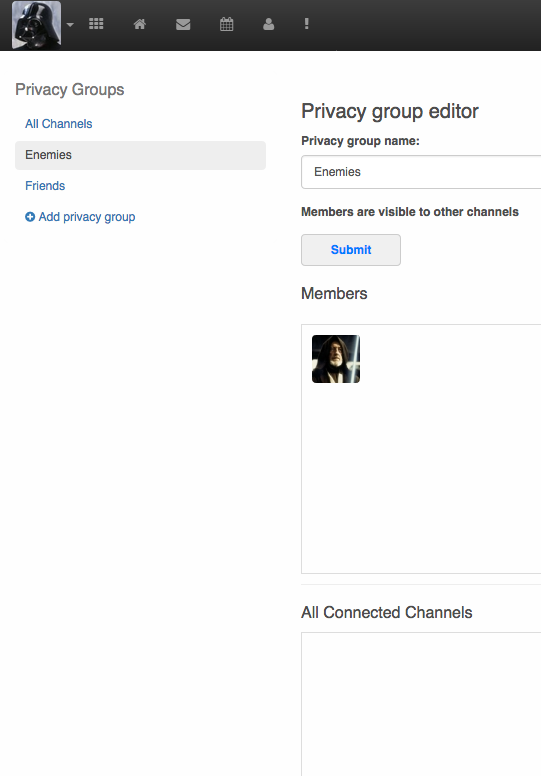 In this editor, you can switch between the existing privacy groups and see at a glance what channels are and are not members of the group. Selecting the icon of a channel in either box will move it to the in or out of the group.