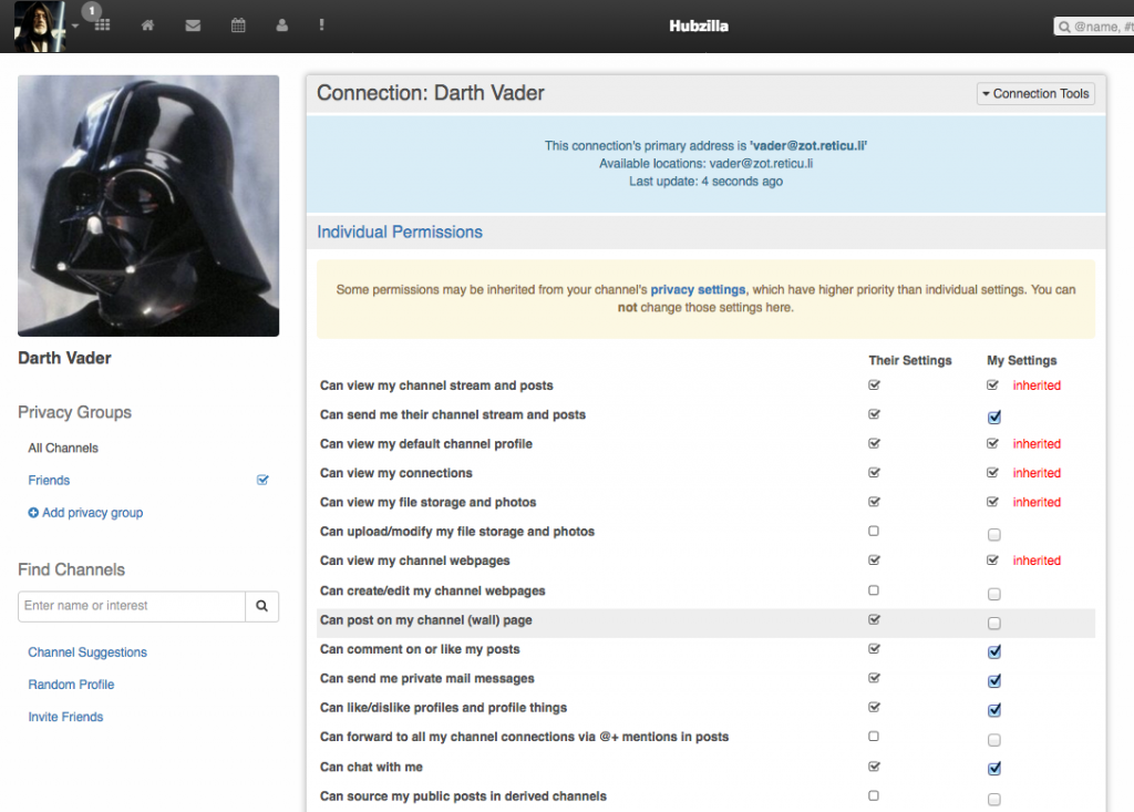 The individual permissions are mostly straightforward, but they can be slightly unclear at first. For example, Can view my file storage and photos does not mean that the connected channel will be able to view all of your photos and files! It means that you will have the option to share photos and files with that channel. It is perfectly possible for you to allow someone to read your posts but disallow them from seeing photos in that post. This kind of unusual situation is, as they say, not a bug; it is a feature.